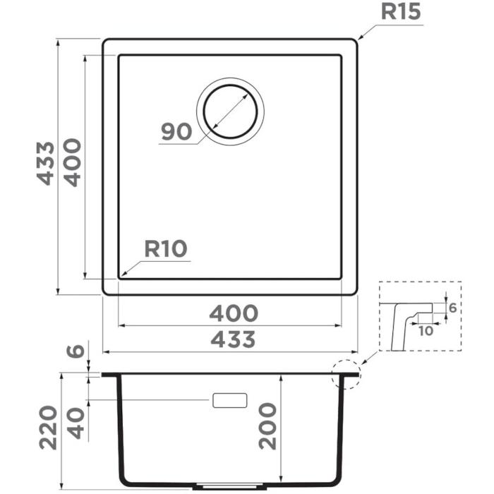 Габариты мойки в мм: 433 x 433