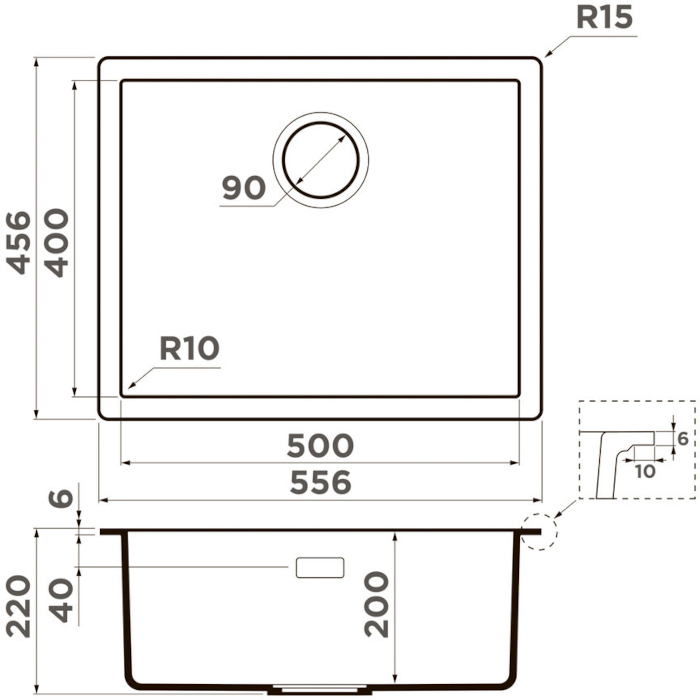 Габариты мойки в мм: 556x456