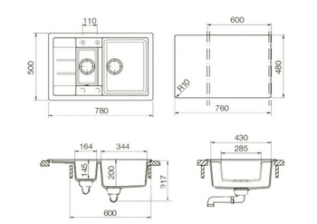 Размеры чаш мойки: вспомогательная - 164х285 мм, основная чаша - 344x430 мм