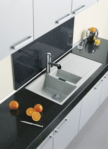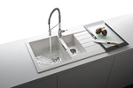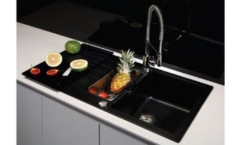 • Передвижная разделочная доска из закаленного стекла в дизайнерском исполнении и коландер из нержавеющей стали предусмотрительно включены в комплектацию.