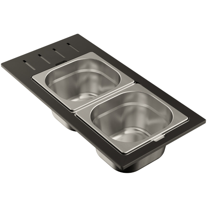 Подходит для моек: Sintesi 116, Sintesi 100, Sintesi 86.Контейнеры коллекции DC представляют собой различные конфигурации, состоящие из нескольких элементов: одной, двух или трех чаш, изготовленных из нержавеющей стали и фиксирующей подставки, изготовленной из высокопрочного HPL пластика. Чаши свободно вынимаются из пластиковой подставки и перемещаются, а конструкция подставки разработана таким образом, чтобы ее можно было удобно разместить на внутренних ступенчатых направляющих моек, коллекций SINTESI.