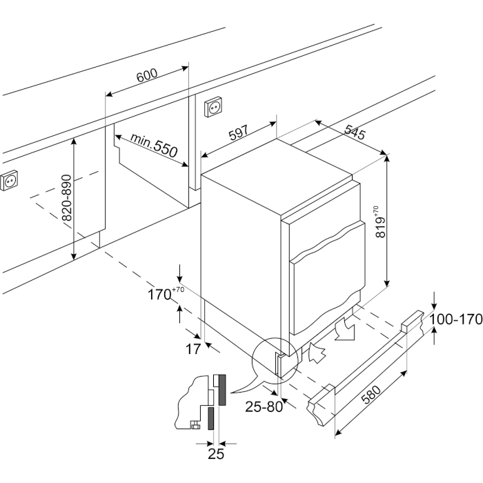 Размеры ниши для встраивания (ВхШхГ): 820-890х600х550 мм